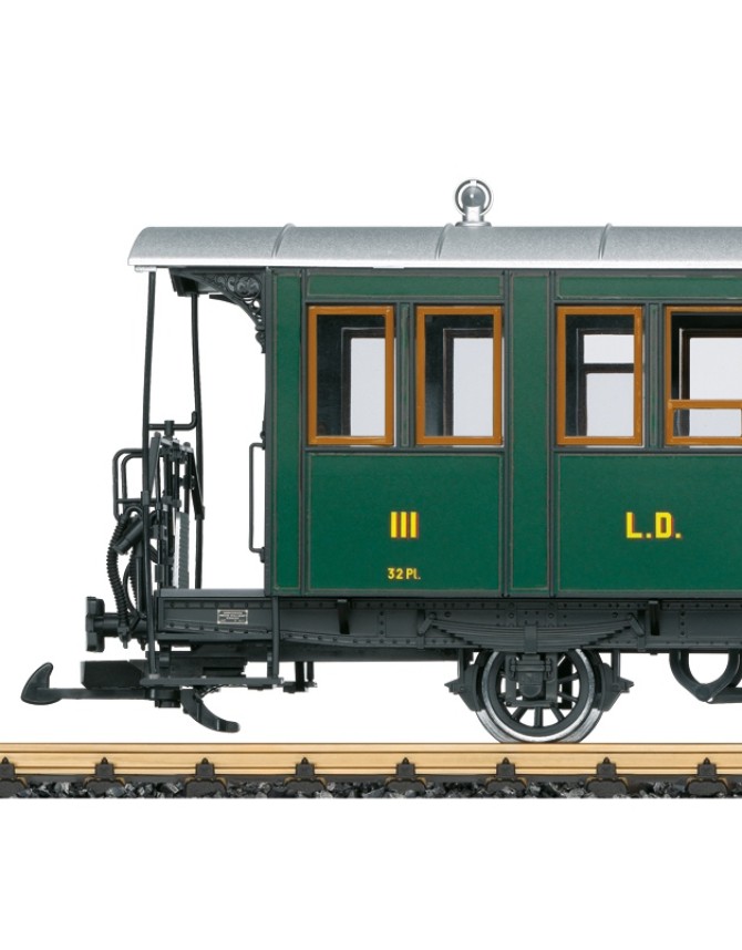 Das LGB Modell bildet einen Personenwagen der 3. Klasse der RhB nach. Ausführung in der grünen Farbgebung der damaligen Landquart-Davos-Bahn, so wie der Wagen heute bei der RhB als Museumswagen im Einsatz ist. Originalgetreue Farbgebung und Beschriftung.